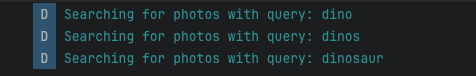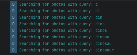처음에는 TextField의 onValueChange에서 바로 API를 호출하고 있었기 때문에, 아래와 같이 입력할 때마다 로그가 찍히고 요청이 전송되었습니다.